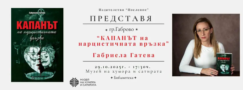 Книгата „Капанът на нарцистичната връзка“ на габровката Габриела Гатева ще бъде представена на 29 октомври 2025 г. – сряда, от 17:30 часа в библиотеката на Дома на хумора и сатирата