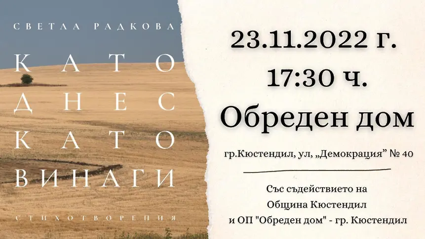 На 23 ноември 2022, сряда, от 17.30 в Обреден дом Кюстендил ще бъде представена новата поетична книга на Светла Радкова "Като днес, като винаги".