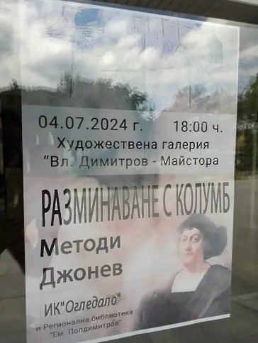 Двайсет и третата поетична книга на Методи Джонев – „Разминаване с Колумб“, ще бъде представена на 04.07.2024 г. /четвъртък/ от 18, 00 ч. в ХГ „Вл. Димитров – Майстора“.