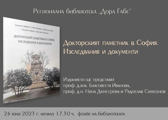 На 26 юни, от 17.30 ч., в Регионална библиотека „Дора Габе“ ще се състои представяне на сборника „Докторският паметник в София. Изследвания и документи“, първото официално публикувано изследване у нас, което събира уникални и неизвестни свидетелства, свързани с историята на монумента. В Добрич изданието ще представят проф. д.изк. Благовеста Иванова, проф.д.н. Нина Дюлгерова и Радослав Симеонов, главен експерт в отдел „Военни паметници” към Министерство на отбраната.