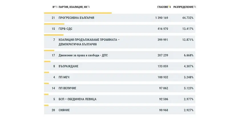 Централната избирателна комисия излезе с първи резултати от предсрочния парламентарен вот на 19 април. При обработени 96.41% СИК протоколи в РИК „Прогресивна България” на Румен Радев води с убедителен резултат от 44.732%.