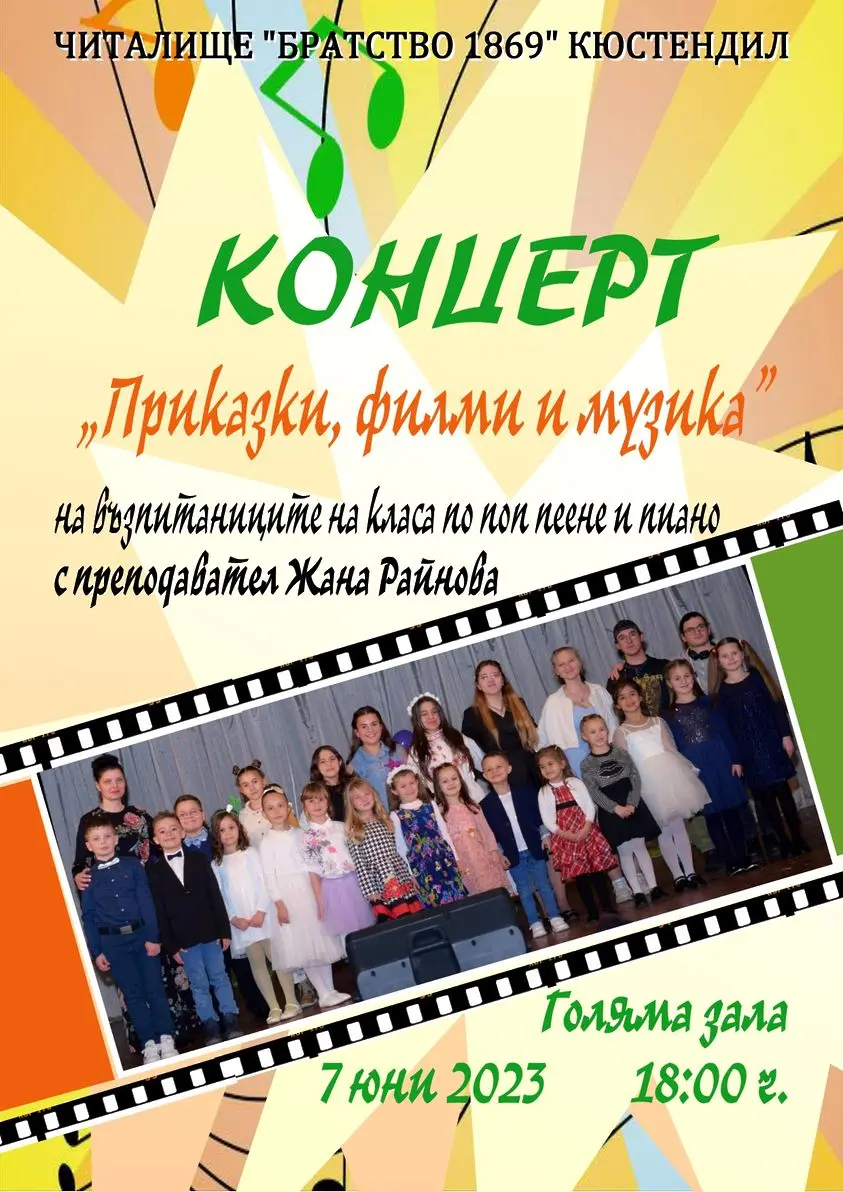 На 7 юни 2023 г. /сряда/ от 18.00 ч. в Голямата зала на читалище „Братство 1869” гр. Кюстендил ще се състои концерт „Приказки, филми и музика” с участието на възпитаниците на класа по поп пеене и пиано с преподавател Жана Райнова. Ще прозвучат мелодии и песни от български и чуждестранни анимационни, детски и игрални филми, „ще оживеят” герои от приказките „Вълкът и седемте козлета”, „Червената шапчица”, „Продавач на надежда” на Джани Родари и др.
