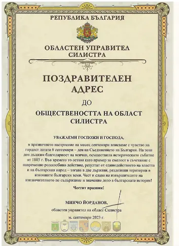 По повод празника областният управител Минчо Йорданов отправи поздрав до обществеността на областта, в който се казва: "Уважаеми дами и господа, в празничното настроение на месец септември вписваме с чувство на гордост датата 6 септември – ден на Съединението на България. На този ден дължим благодарност на всички, осъществили историческото събитие от 1885 г. Във времето то остава като пример за смелост в съчетание с навременно родолюбиво действие, резултат от единодействието на властта и на българския народ – тогава в две държави, разделящи територии в изконните български земи. Чест и слава на извършителите на изключителното по съдържание и значение дело в българската история!".