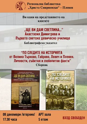 Регионална библиотека „Христо Смирненски“ – Плевен ще представи две нови издания: библиографския указател „Ще ви дам светлина… Анастасия Димитрова и Първото светско девическо училище“ и сборника „По следите на историята от Велико Търново, Габрово, Ловеч и Плевен. Личности, събития и любопитни факти“. Представянето ще се състои на 9 декември от 17:30 часа в АРТ залата на петия етаж на библиотеката, непосредствено преди празника на град Плевен, като събитието е с вход свободен и отворено за широката общественост.