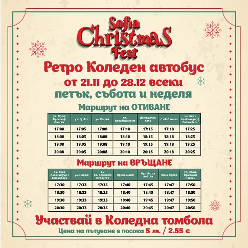 От 28 ноември до 28 декември 2025 г., всеки петък, събота и неделя, столичани и гости на града ще имат възможност да се повозят на красив, празнично украсен автобус, който съчетава ретро чар, уют и празничен дух.