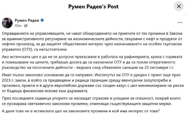 Оправданията на управляващите, че чакат обнародването на приетите от тях промени в Закона за административното регулиране на икономическите дейности, свързани с нефт и продукти от нефтен произход, за да защитят обществения интерес чрез назначаването на особен търговски управител (ОТУ), са несъстоятелни, написа държавният глава Румен Радев във Фейсбук.
