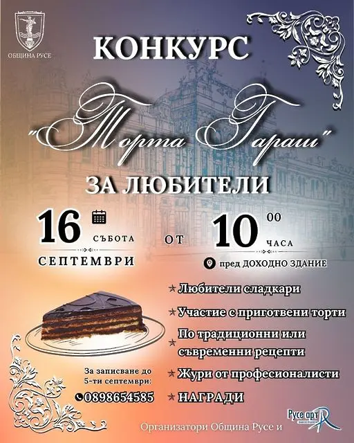 До 5 септември русенци могат да се запишат за участие в Конкурса за любители сладкари. Той ще се проведе на 16 септември /събота/ от 10 ч. пред Доходното здание в рамките на Фестивала на торта Гараш. Събитието се организира за втора поредна година от Община Русе, ОП "Русе арт", като в подготовката активно са включени и представители на бизнеса и местните културни институти.