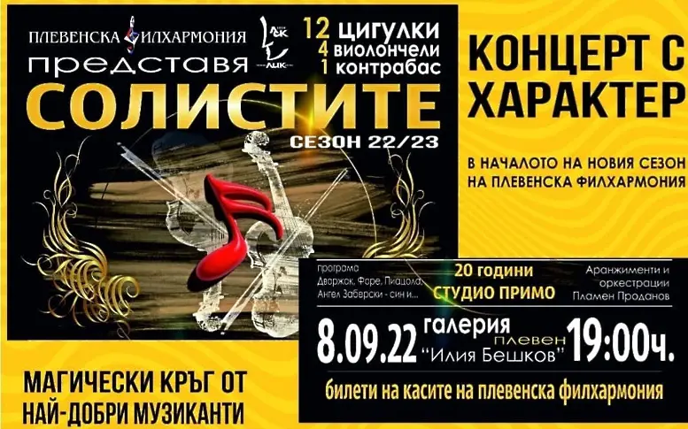 На 8-ми септември 2022 г., от 19:00 часа в Художествена галерия "Илия Бешков" в Плевен ще се състои юбилеен концерт на Камерен оркестър "Студио Примо", създаден преди две десетилетия в Плевен. Заглавието на музикалното събитие е "Солистите" и в него ще участват 17 музиканти, част от които идват в Плевен от различни части на света.