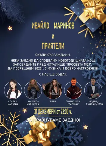 Сцената ще бъде пред читалище „Просвета 1927“, а на нея ще се качат Славка Калчева, Михаела Маринова, Прея и огнено шоу „Палячи“.Програмата ще започне в 23:00 ч. на 31 декември, съобщи в социалните мрежи районният кмет Ивайло Маринов.
