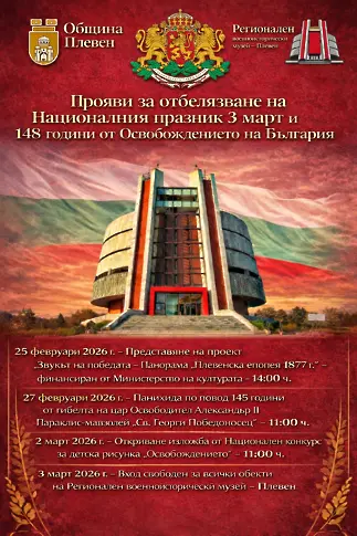 По повод Националния празник на Република България, Община Плевен и Регионален военноисторически музей – Плевен имат удоволствието да Ви поканят да отбележим заедно 3 март с тържествена програма посветена на 148 години от Освобождението на България.