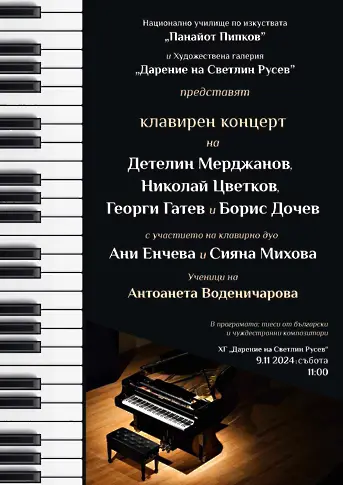 09.11.2024 г.(събота) - 11:00 ч. - Клавирен концерт на Детелин Мерджанов, Николай Цветков, Георги Гатев и Борис Дочев с участието на клавирно дуо Ани Енчева и Сияна Михова. Ученици от класа по пиано в НУИ "П. Пипков", Плевен с преподавател Антоанета Воденичарова.