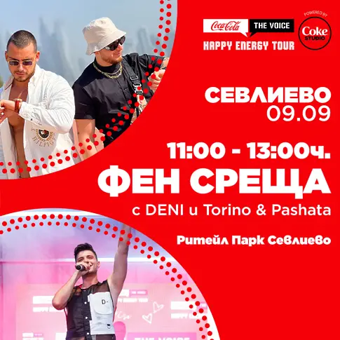 Ела малко по-рано, защото ще повдигнем още настроението с активностите на Coca-Cola и ще се подготвим за едно незабравимо парти. Срещни се с любимия инфлуенсър на България DENI и латино генг кралете Torino & Pashata. С твоите тийн идоли може да се видиш на живо, да се снимаш, да си вземеш автограф, както и да имаш възможността да си спечелиш FRONT ROW пропуск за концерта в Севлиево.