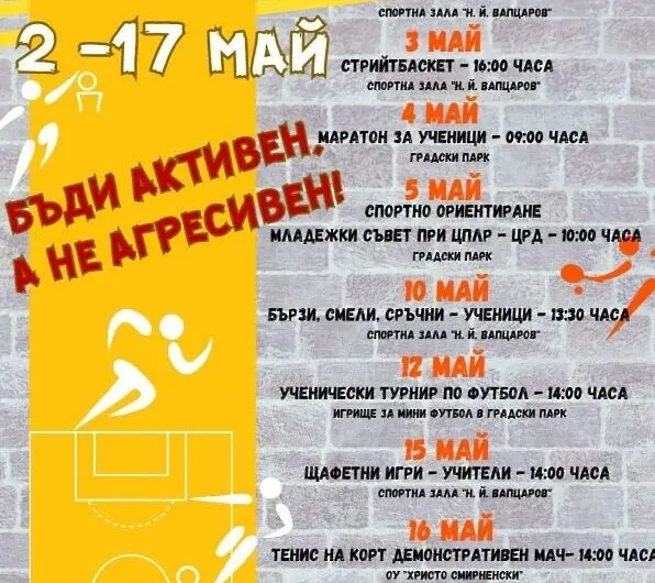 Навръх Деня на българския спорт – 17 май, Спортната седмица ще бъде закрита със семейна спартакиада, която при хубаво време ще се проведе на футболното игрище с изкуствена настилка в центъра на града.