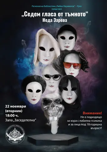 На 22 ноември (вторник) в 18:00 ч. в зала „Заседателна“ Неда Зарева представя новата си книга „Седем гласа от тъмното“ с оригинален пърформанс за едно уникално преживяване на публиката. Тази книга е особена като героите си. Те нямат имена, посочени са с качество на личността им: Изстрадалата, Гневния, Благородния, Смелата, Лъжкинята, Перфекционистката или с онова, което могат - Жрицата. През дневници, разкази, истории се показва развитието на взаимоотношенията в една група - малката група като метафора на цялото човечество.