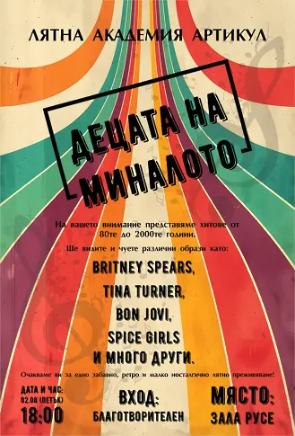 На 2 август, петък, от 18:00 часа, в зала "Русе", ще се проведе концерт на школа "АРТиКУЛ", който носи заглавието "Децата на миналото". На сцената ще бъдат представени хитове от 80-те до 2000-те години. Публиката ще види и чуе образи като Бритни Спиърс, Тина Търнър, Спайс гърлс, Бон Джоуви и много други.