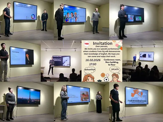 Ивалина Иванова - старши учител по английски език и Галина Дамянова - ЗДУД приветстваха гостите и откриха събитието. Учениците представиха интересни презентации и видеоклипове, създадени с помощта на различни AI инструменти, по модела на TED беседи. Това подчерта тяхната увереност при публично говорене и отлична езикова подготовка по английски език.