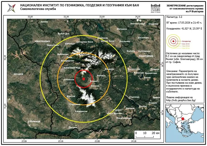 Земетресение с магнитуд 3,2 по Рихтер е регистрирано в 21:43 ч. в района на Югозападна България, съобщиха във фейсбук от Националния институт по геофизика, геодезия и география (НИГГГ) към Българската академия на науките.