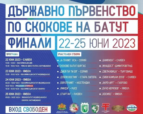 Държавното първенство по скокове на батут ще се проведе от 22 до 25 юни със съвместното домакинство на Сливен и Ямбол.