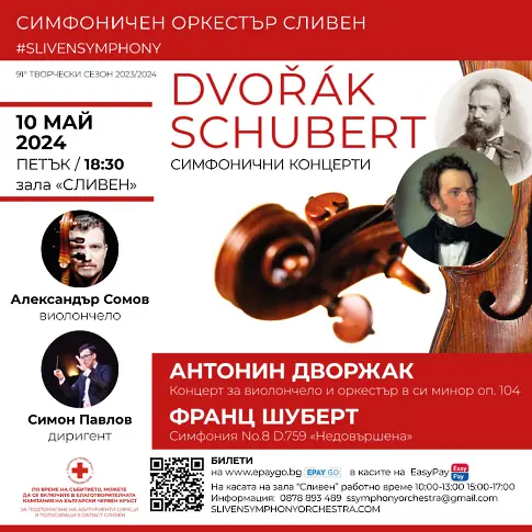 Мащабният концерт за виолончело от Антонин Дворжак и Симфония № 8 “Недовършена” от Франц Шуберт ще прозвучат в рамките на 91-ия творчески сезон на Симфоничен оркестър Сливен и на Майски дни на културата “Сливенски огньове” 2024.