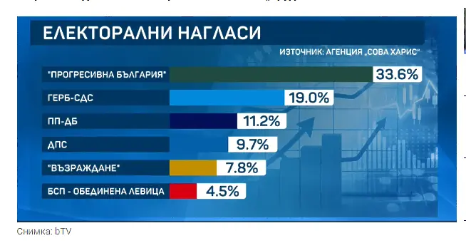 Според агенцията първи са от „Прогресивна България“ с 33,6%, а втори - ГЕРБ-СДС с 19% от гласовете.