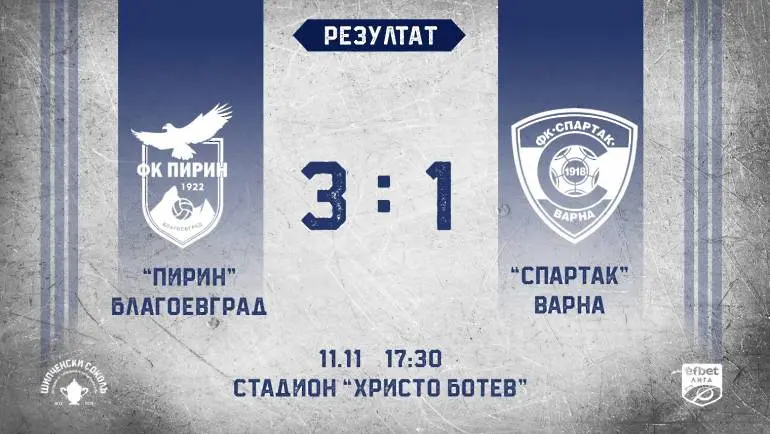 Спартак Варна загуби от Пирин Благоевград с 1:3 в мач от 18-ия кръг на efbet Лига. Двубоят започна равностойно. На два пъти точен за “орлетата” бе Радослав Цонев (13, 34) и Мартин Смоленски (55), а за “соколите” с попадение се отчете Родни Антуи (38), съобщава официалният сайт на варненци.