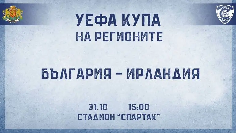 Стадион „Спартак” отново ще е домакин на среща от кръг на УЕФА Купа на Регионите. Страната ни е в група с отборите на Румъния, Сан Марино и Република Ирландия. Първите двубои на България – на 25 и 28.10. се провеждат в Албена (срещу Румъния и Сан Марино), а на 31 октомври от 15:00 ч. мачът срещу Република Ирландия ще се изиграе на стадион „Спартак” във Варна. Страната ни е домакин на двубоите от група 6, а победителят ще се класира за финалите на УЕФА Купа на регионите 2023, които ще се състоят през юни догодина.
