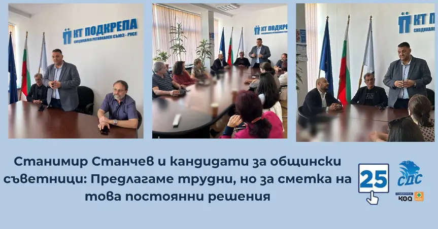 „На този град му трябват трудолюбиви хора, които искат да надграждат. Един управник трябва да си подреди и изчисти града, за да живеят хората спокойно. А също и да си държи на думата, защото мандатът минава и заминава, но хората в града остават едни и същи. Когато след мандата ги срещнеш, трябва да си с гордо вдигната глава и да ги гледаш в очите. Знам, че е много трудно, защото нямаме подкрепата на сглобки, на силни партийни централи, на олигархията. Затова разчитам на независимите хора, които имат енергията, желанието, импулса и искат да видят блясъка в Русе. Дължим го на поколенията след нас.„ - Това каза кандидатът за кмет от СДС Станимир Станчев на среща с представители на КТ „Подкрепа“, в която се включиха и част от кандидатите за общински съветници. Той благодари на участниците за предоставената възможност за диалог и сътрудничество.