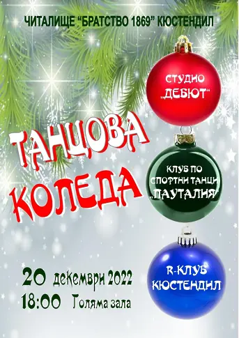 На 20 декември 2022 г. от 18:00 ч. читалище „Братство 1869“ Ви кани на „Танцова Коледа” – спектакъл с участието на Студио „Дебют” с ръководител Димитринка Укалска, Клуб по спортни танци „Пауталия” с ръководител Петя Димитрова и R-клуб Кюстендил с ръководител Рени Цветкова.