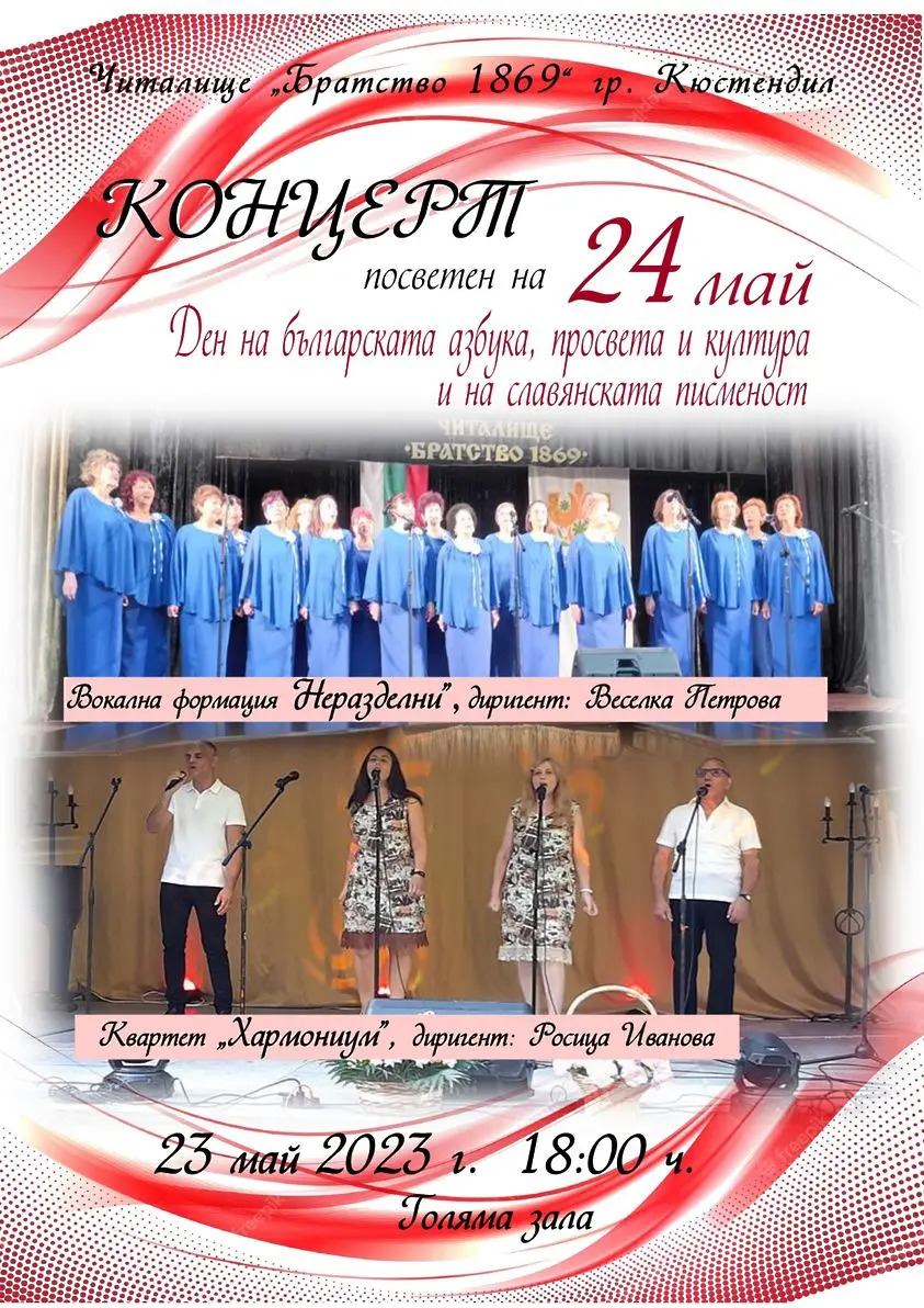 На 23 май 2023 г. от 18:00 ч. в Голямата зала на читалище „Братство 1869” ще се проведе Тържествен концерт по случай 24 май – Ден на светите братя Кирил и Методий, на българската азбука, просвета и култура и на славянската книжовност.