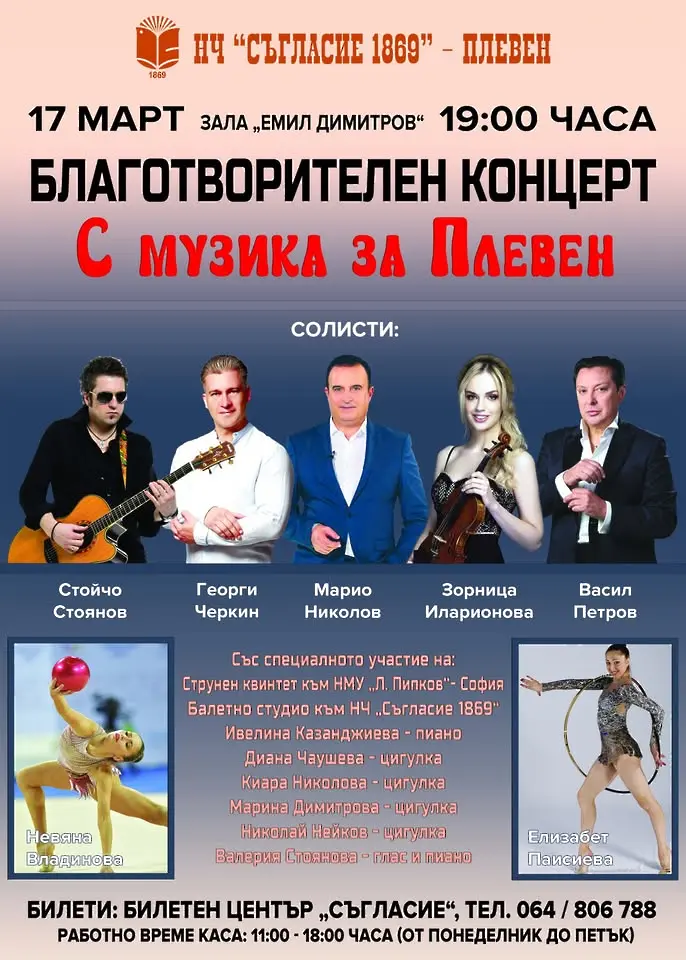 На 17-ти март в Плевен ще се състои благотворителен концерт „С музика за Плевен”. Музикалното събитие е в подкрепа на закупуването на нов концертен роял за НЧ „Съгласие 1869“ - Плевен.
