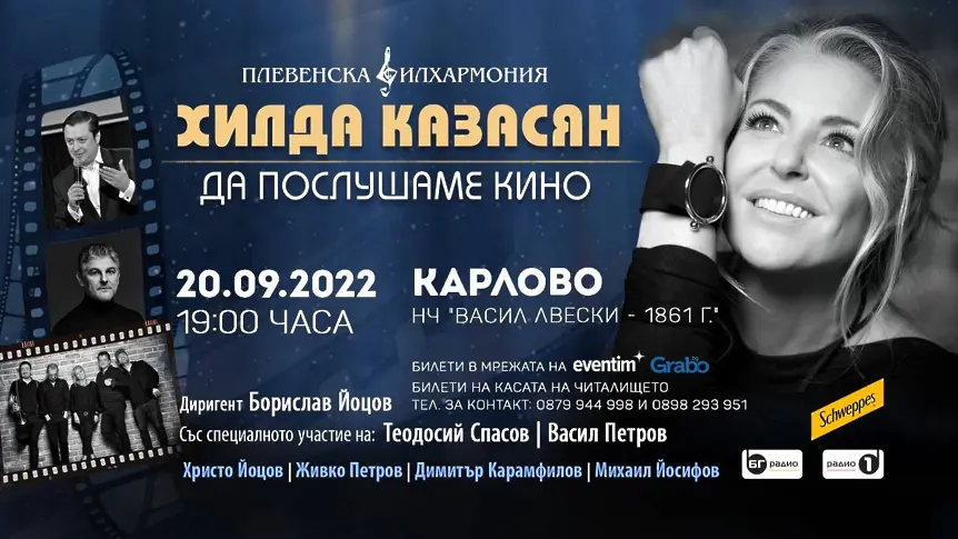 На 20-ти септември – вторник, музикантите от Плевенска филхармония, солистите Хилда Казасян, Васил Петров и Теодоси Спасов, заедно с Христо Йоцов, Живко Петров, Димитър Карамфилов и Михаил Йосифов, под диригентската палка на Борислав Йоцов, ще поднесат в Карлово концерта „Да послушаме кино“.