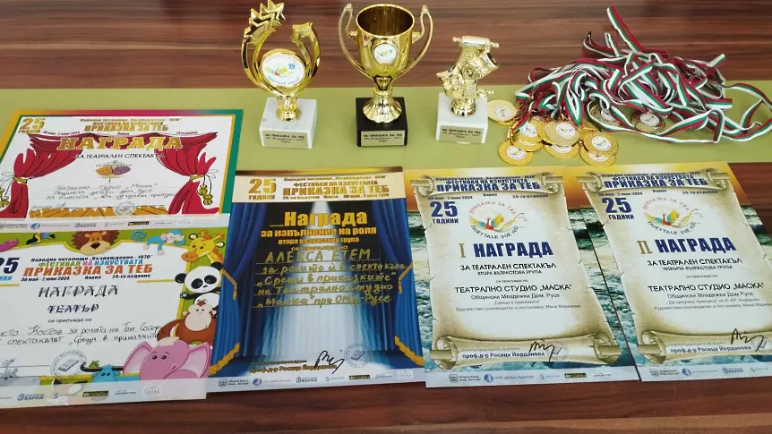 Театрално студио „Маска“ към Общинския младежки дом се завърна с пет награди от националния фестивал на изкуствата „Приказка за теб“, който се проведе във Варна. Талантливите деца и младежи участваха с две пиеси в различни възрастови групи, впечатлявайки жури от професионалисти в театралното изкуство и детско жури. Те бяха поканени да открият 25-ото издание на фестивала с пиесата „Срещи в приказките“.