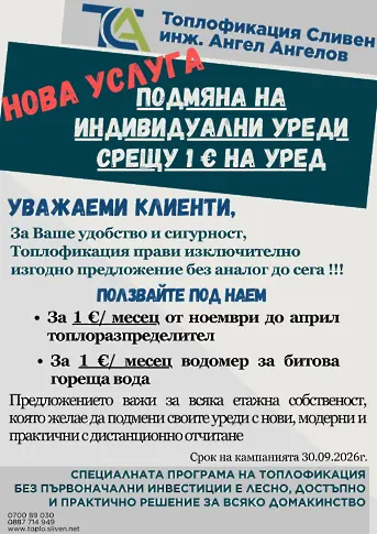"Топлофикация-Сливен-инж.Ангел Ангелов" предлага изцяло нов, разумен и достъпен избор за ползване на уреди за дялово разпределение. С новата програма за ПОДМЯНА на уреди за дялово разпределение срещу 1€, клиентите получават технологията на утрешния ден още днес – без скрити такси, без ангажименти от посещения и със спокойствие за точността на измервателния уред.