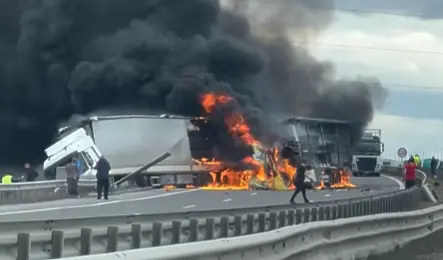 Катастрофа между камиони е станала на Северната скоростна тангента до София. Кадри в социалните мрежи показват, че след удара между двата тира е възникнал пожар. Единият камион е излязъл от пътя.