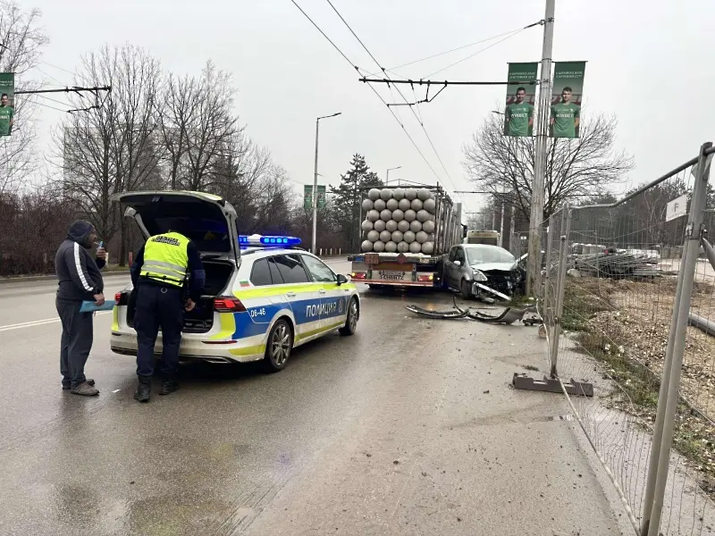 ТИР-ът само леко е одраскал лекия автомобил, но колата е отнесла част от огражденията на строящия се парк и се е спряла в стълб.