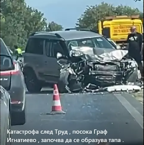 Тежка катастрофа е станала след село Труд в посока Граф Игнатиево. Според публикувани в социалните мрежи кадри, две коли са участвали в инцидента – едната е с тежки щети по предната част, а другото превозно средство е излязло извън пътя и се е преобърнало в канавката.