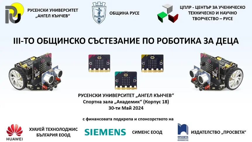 На 30-ти май 2024 г. от 14:00 часа ще бъде дадено началото на третото общинско състезание по роботика за деца от 3 и 4 клас. Събитието ще се проведе в Спортна зала „Академик“ на Русенски университет „Ангел Кънчев“ и се организира по инициатива на Община Русе, Русенската Алма Матер и Центъра за подкрепа за личностно развитие – Център за ученическо техническо и научно творчество (ЦПЛР–ЦУТНТ-Русе). Генерални спонсори на третото издание на събитието са Хуауей Технолоджис България ЕООД, Сименс ЕООД и Издателство „Просвета - София“ АД.