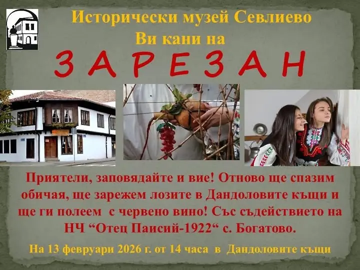 Община Севлиево и Исторически музей - Севлиево отново организират пресъздаване на обичаите за празника Трифон Зарезан. Днес, 13 февруари от 14:00 часа в Дандоловите къщи севлиевци ще зарежат лозите, а възстановка на обичаите ще представи НЧ “Отец Паисий 1922” - село Богатово.