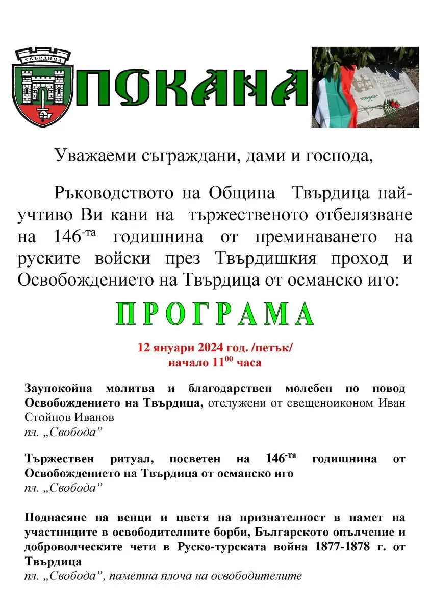 Рьководството на Община Твърдица кани жителите и гостите на града на тържественото отбелязване на 146-та годишнина от преминаването на руските войски през Твърдишкия проход и Освобождението на Твърдица от османско иго.