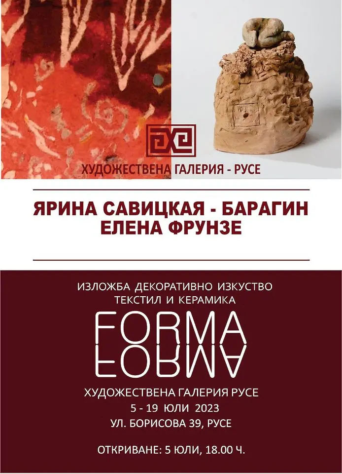 Изложбата „Форма/Форма“е резултат от експерименти и изследвания, проведени от авторите през последните години. Изработените текстилни и керамични повърхности транскрибират идеята за вибрация, която се предава чрез дву- и триизмерни форми, което е основният творчески ресурс. Чрез малки отклонения, прекъсвания, нюанси и хроматични контрасти художниците изграждат образи, които от своя страна визуално водят до различни наративи.