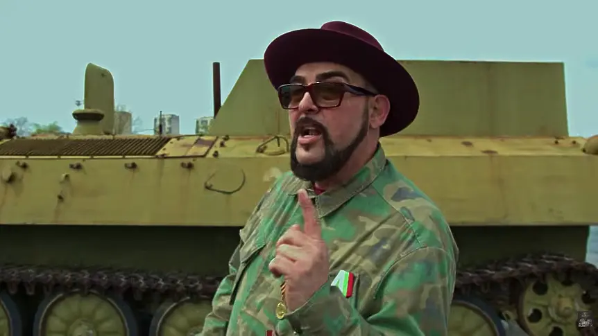 Клипът, който е генериран с изкуствен интелект, показва вижданията за изпълнителя на ставащото в страната, като контрапункт на това е представен самият той в танк.