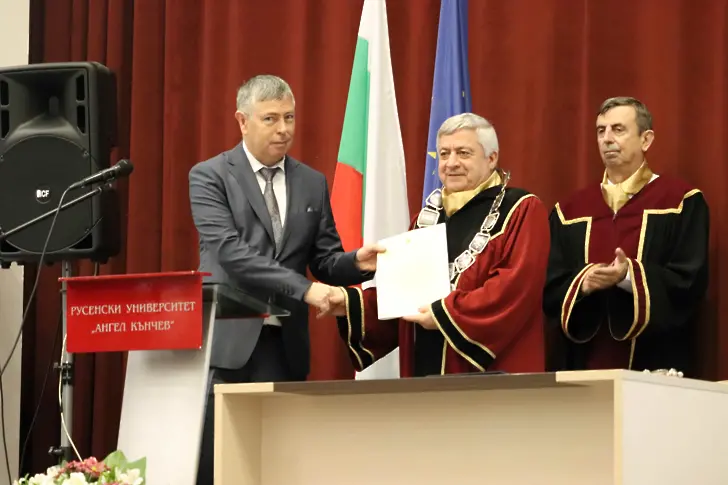 Четирима професори, петима доценти и един доктор на науките получиха дипломите си за придобити научни степени и звания през настоящата година в Русенския университет „Ангел Кънчев“. На церемонията, която се организира по случай празника на учебното заведение, присъстваха областният управител Данаил Ковачев и неговият заместник Георги Георгиев. „Русенският университет се доказа като място, където традициите и новаторството намират пресечна точка, където опитът и модерният дух не си противоречат, а съжителстват заедно в името на утвърждаването на качествено образование и високоефективна научна дейност. Вече повече от 70 години Русенският университет достойно носи името на Ангел Кънчев и се развива като водещ учебен и научен център с доказан международен авторитет. Постигнатото през годините е повод за уважение и пример за добре свършена работа, преодоляване на трудности и утвърждаване на доверие. Високо оценявам това, което правите и вярвам, че Вашата дейност освен повод за гордост и професионално удовлетворение е пример за стремежа към нравствено израстване и просвещение“, каза Ковачев в обръщението си към ректора академик Христо Белоев и преподавателите. „В динамичните и сложни времена, в които живеем, считам, че именно все по-отчетливото интегриране на образованието и науката в живота ни е ключът към устойчивото развитие на всяка една общност“, допълни още той. На получилите дипломите си научни степен и звания той пожела да се радват на успехите си и да непрекъснато да ги умножават. „На добър час във всяко ново начинание. Бъдете отговорни и последователни! Със знания и мъдрост постигайте целите си! Използвам повода, за да Ви уверя, че винаги може да разчитате на Областна администрация – Русе. Както и досега ние ще продължим да бъдем Ваш партньор, като Ви гарантирам, че сътрудничеството между двете институции ще се развива“, заяви Ковачев. Също така областният управител изрази уважението си към преподавателите и докторантите, като им пожелавам нови успехи в научно-изследователската дейност, а на студентите – подобаваща професионална реализация, която да им позволи да осъществяват мечтите си. Днес дипломите си получиха и над 30 успешно защитили докторанти.