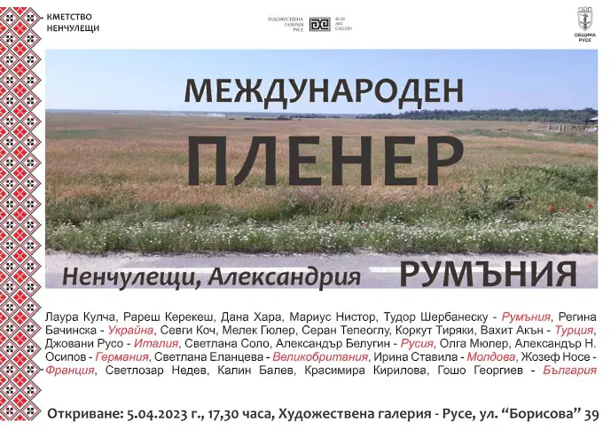 Днес, 05.04.2023 г. от 17,30 ч. В художествена галерия – Русе ще се открие изложба с творби от международен пленер, който се провежда в с. Ненчулещи, Александрия, Румъния. Изложбата включва живописни 33 платна от 23 автори. Куратор е Тудор Шербанеску.