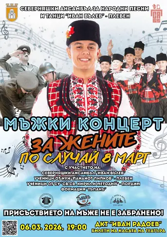 За пета поредна година Северняшкият ансамбъл за народни песни и танци „Иван Вълев” ще зарадва публиката в Плевен с „Мъжки концерт за жените”. Спектакълът е на 6 март (петък) и е посветен на Международния ден на жената. Начало - 19.00 часа, място - сцената на ДКТ „Иван Радоев“ - Плевен. Билети все още могат да бъдат закупени на касата на театъра.