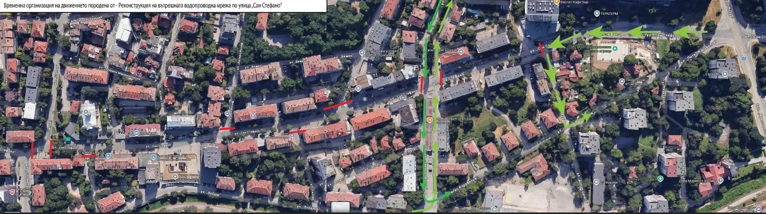 В района на кръстовището на ул. „Сан Стефано“ и ул. „Генерал Колев“ движението ще бъде възможно само по ул. „Генерал Колев“, без възможност за навлизане по ул. „Сан Стефано“ в затворения участък.