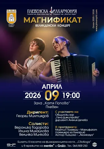 Плевенска филхармония, заедно с Общински хор „Гена Димитрова” с диригент Анелия Дечева и солистите: Илина Михайлова – сопран, Величка Минкова – мецосопран и Вероника Тодорова – акордеон, обединяват творческата си енергия в един изключителен концерт със силното заглавие МАГНИФИКАТ.