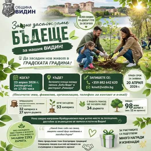 Засаждането ще се извърши на 23 април 2026 година (четвъртък) от 17:00 часа в зелените площи между замъка „Баба Вида“ и ресторант „Ривиера“.