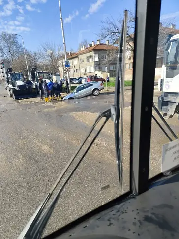 Според свидетели водачката е преминала през участъка въпреки предупреждения от работници на ВиК. Наложило се е извикване на специализирана техника за изтегляне на автомобила.