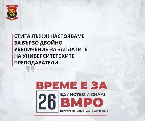 Всички кандидати от листата на ВМРО – Русе за народни представители от 19 МИР подкрепят справедливите искания на Съвета на ректорите на висшите училища в Република България от 17 май 2024 година за незабавно увеличение на възнагражденията.