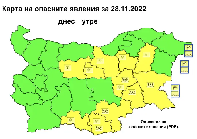 Жълт код за опасно време е обявен за област Габрово днес. По данни на НИМХ се очакват валежи от сняг и образуване на тънка снежна покривка.